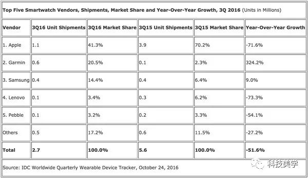来到2016年,智能手表相比起高歌猛进的2015年,数据有了大幅度的下滑。据IDC的数据调查报告,Q1~Q3的数据分别为1970万台,350万台,270万台,同比2015年同时期分别为增长67.2%,下跌32%,下跌51.6%。也许是智能手表的跌势实在太严重,因此来到2016年Q4,IDC开始将智能手表并入智能穿戴设备中一同算数。