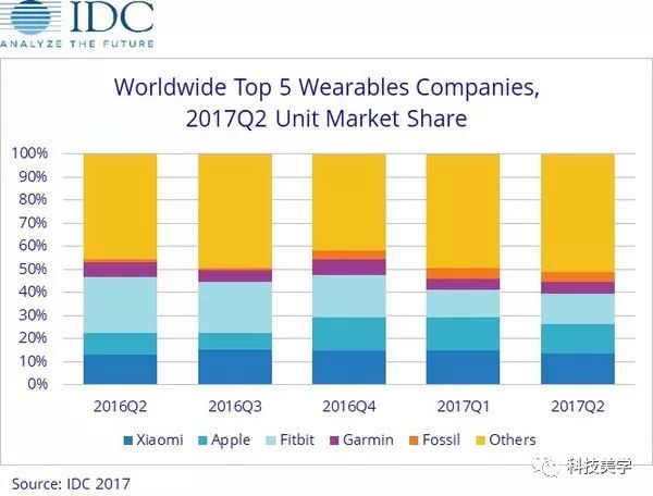 但从2016年Q4开始到2017年Q3,同比增长率也没有为市场带来富有冲击力的数据。从2016年Q4到2017年Q4,同比增长数据为17.9%,10.3%和7.3%。逐渐萎缩的数据让人不仅是对智能手表,而且是对整个智能穿戴行业开始看衰。如果要说值得兴奋的,是在2017年Q2的数据中,我们可以看到不能运行第三方应用的可穿戴设备销售数据首次出现滑坡,但同比0.9%的降幅并不算太大的影响。