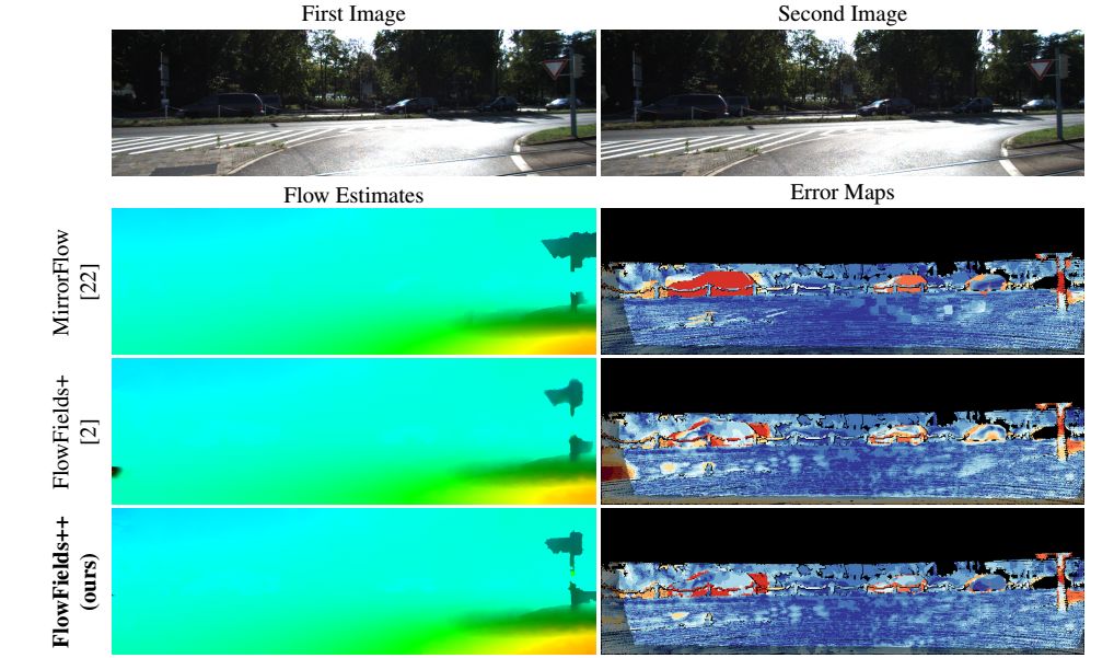 图 2 在KITTI上的一个结果比较。左侧是估计的光流,右边是误差。与FlowFields+算法相比,本算法在边界外的区域依然估计准确。参见图中Error Map中的阴影区域。