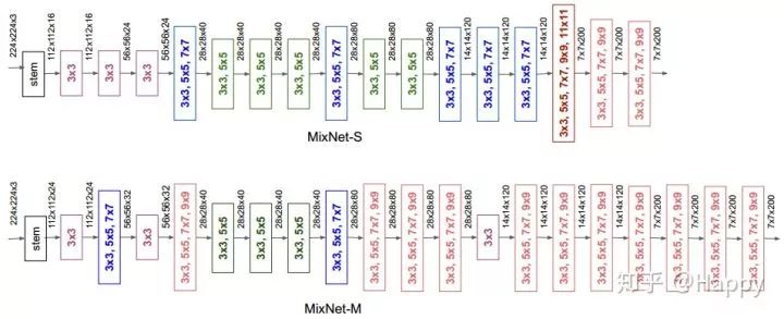 MixNet-S, MixNet-M两个网络的架构图如下所示。更多关于MixNet的信息请参考原文,这里不再详述。