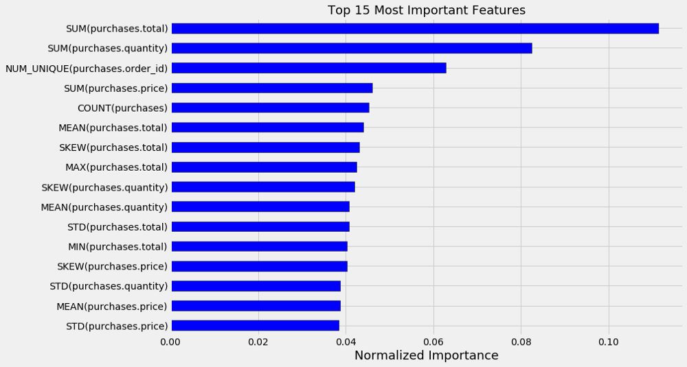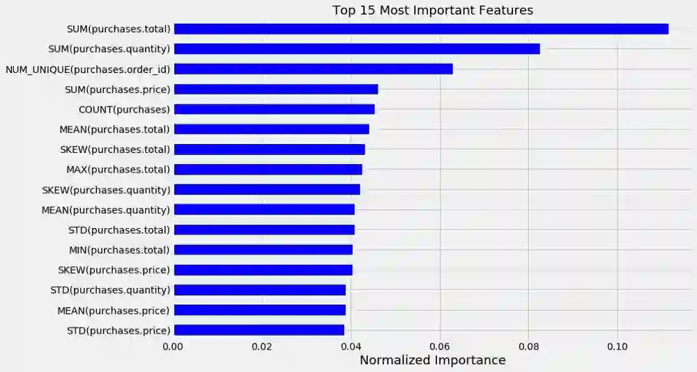 除了预测性能外,Featuretools 实现还能提供一个很有价值的东西:可解释性功能。下面,我们来看看随机森林模型中 15 个最重要的特征:
