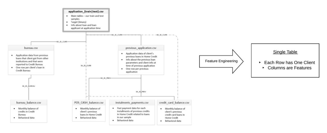 Home Credit Loan 问题是于今日在 Kaggle 上结束的一项机器学习竞赛项目,其目标是预测客户是否能够偿还贷款。对于数据科学家而言,这个问题的挑战在于其数据的大小及所分布的范围。我们来看下完整的数据集,可以看到分布在七张表中有 5800 万行数据,而机器学习方法需要针对一张表进行模型训练。此时,特征工程就需要将每个客户的所有信息提取并融合到一个表中。