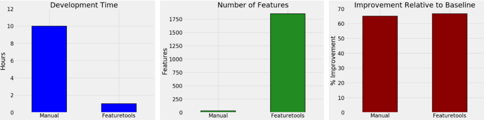 使用提取的特征训练模型所取得的相对于基线的性能改进:手动特征工程性能改进65%,而自动化特征工程取得了 66% 的提升。