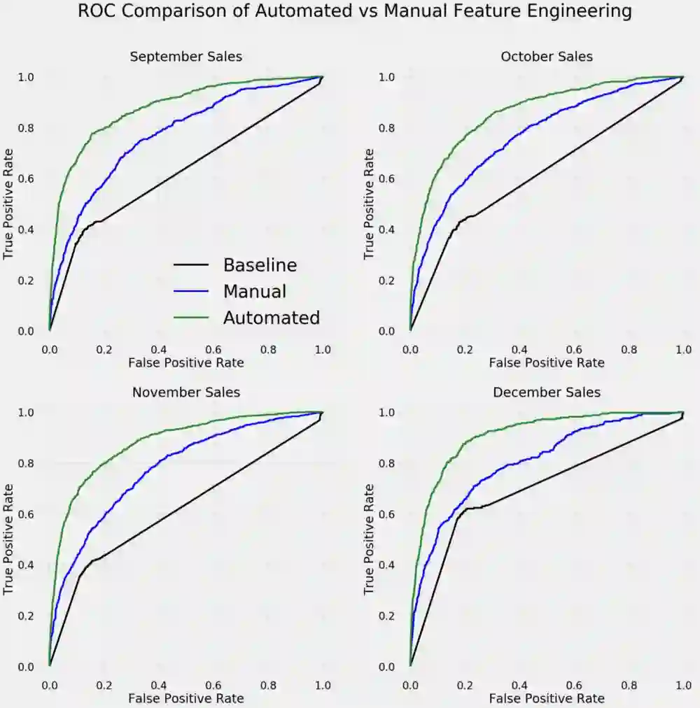 即使手动特征工程需要花费比 Featuretools 多得多的时间,但我也无法创建出一组性能接近相同的特征。下图显示了使用在两个数据集上使用训练的模型对未来月客户支出预测的 ROC 曲线,其中越靠近左上角的曲线代表更好的性能: