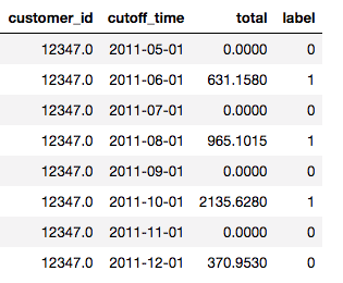运行 Deep Feature Synthesis 得到的结果是一个特征表,即每个客户在每个月对应一个特征。我们可以使用这些特征和标签来训练我们的模型,然后对往后的任何月份进行预测。此外,我们不用担心构建模型所使用的特征会包含未来的信息,也不用担心由此导致不公平性及错误的训练得分。