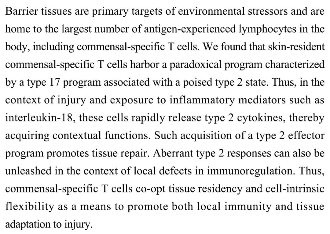 (导读 王思菲)屏障组织是环境压力的第一道防线,也是包括共生特异性T细胞在内的抗原接触淋巴细胞的主要存在场所。本研究发现位于皮肤的共生特异性T细胞兼具17型程序和静息2型状态特征。当组织损伤并暴露于炎症因子如白介素-18时,这些细胞快速释放2型细胞因子,从而促进组织修复。因此共生特异性T细胞协调组织驻留及细胞内在可塑性促进局部免疫及组织应对损伤的适应性。