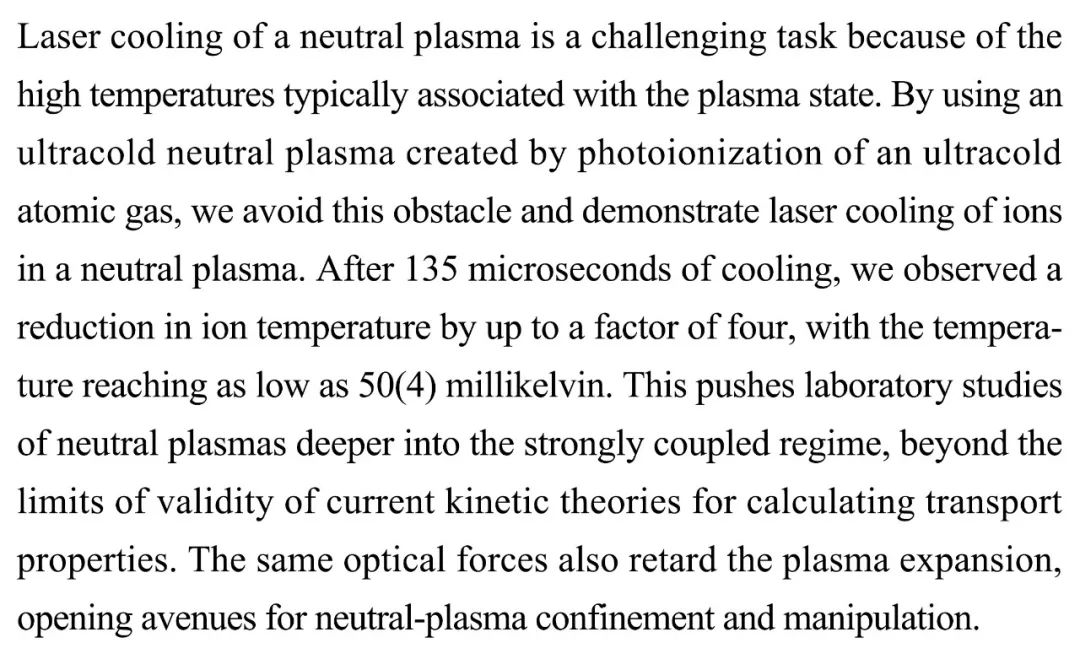 (导读 阿金)由于等离子体通常处于高温状态,对中性等离子体进行激光冷却颇具挑战。本研究利用超冷原子气体光电离出的超冷中性等离子,克服了上述障碍,在经历了135微秒的冷却之后,观察到离子温度下降到原来的1/4,最低达到50毫开尔文。该结果有助于深入了解强耦合下的中性等离子体。