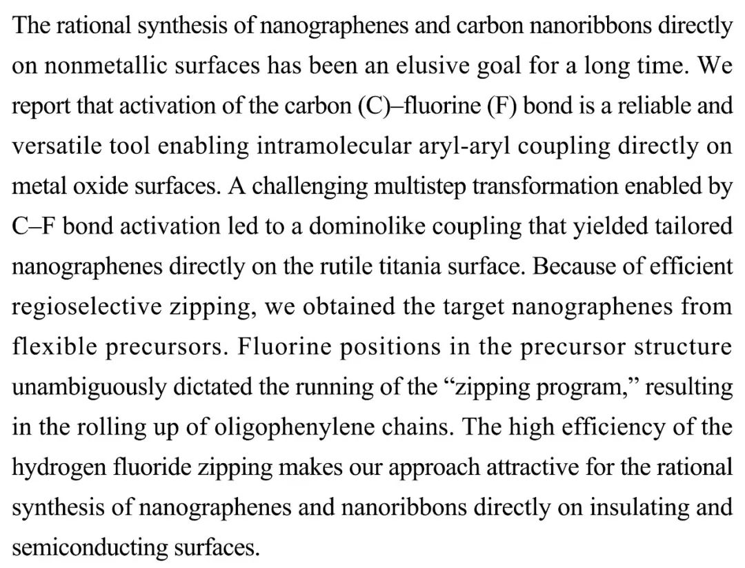 (导读:向菲菲)直接在非金属表面上合成纳米石墨烯和碳纳米条带一直是较难实现的目标。研究人员发现活化碳-氟键是一种可靠的工具,能在金属氧化物表面上实现分子内芳基-芳基偶联。激发碳-氟键诱导的多步反应转化能引起多米诺似的偶联反应,可在金红石TiO2表面上剪裁纳米石墨烯。这种高效的氢氟“拉链反应”,使得直接在绝缘和半导体表面上程序合成纳米石墨烯和纳米条带成为可能。