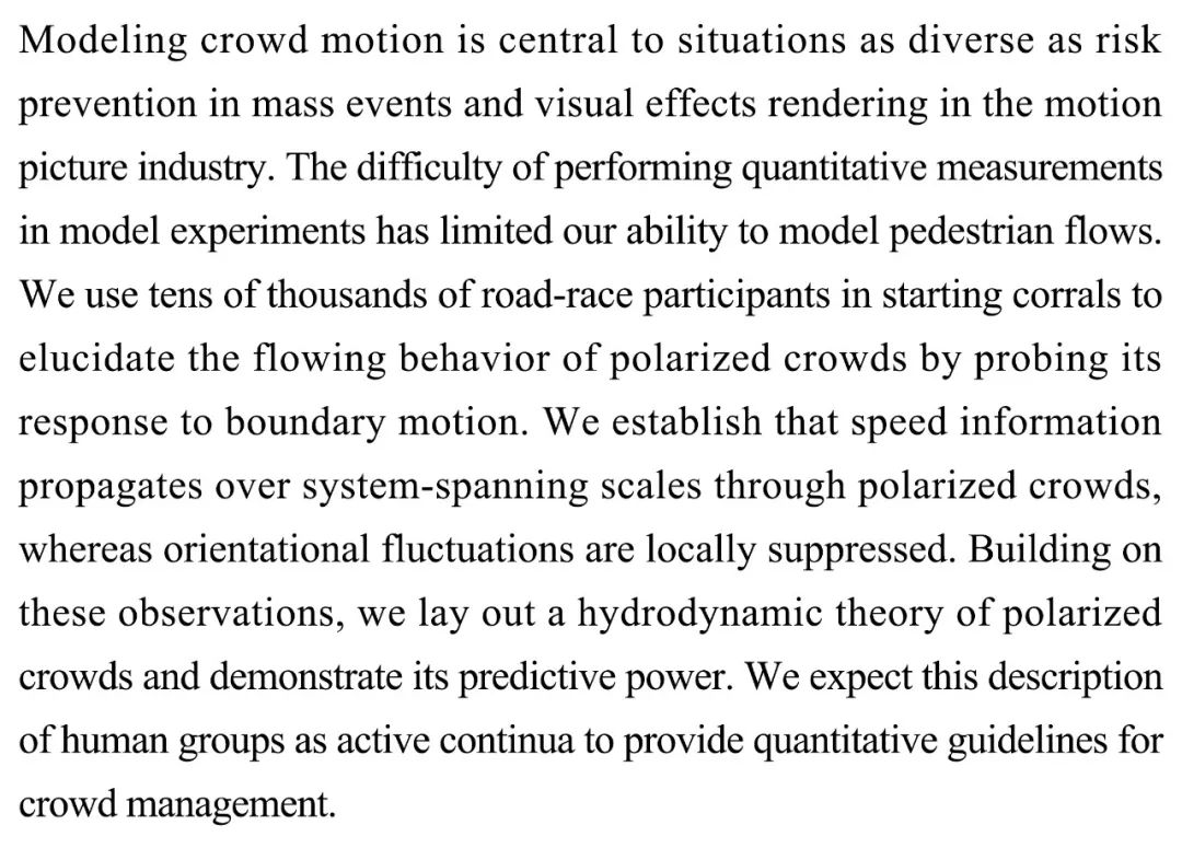 (导读 胡琦琳)本研究利用成千上万的公路参与者,并将他们围起来,通过探究其边界运动的动态响应阐明极化人群的流动行为。基于观察,研究人员提出了极化人群的流体力学理论,并证明了这项理论的预测能力。研究人员希望可以将这样的人类群体描述作为连续统,为人群管理提供定量的指导。