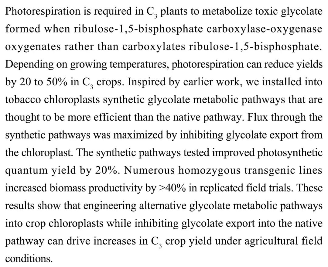 (导读 阿金)碳三植物通过光呼吸作用来排除内部的有毒代谢产物乙醇酸,但是会减少作物产量。本研究将合成乙醇酸代谢通路引入烟草叶绿体中,通过抑制叶绿体中的乙醇酸输出,使合成通路的通量最大化,从而将光合作用量子产率提高20%。在田间实验中,纯合转基因种系生物量生产力可增加40%。该结果表明替代性乙醇酸代谢通路工程设计的潜在应用价值。