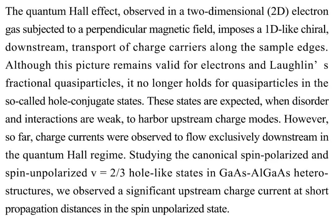 (导读 阿金)在垂直磁场中二维电子气观察到的量子霍尔效应会沿着样品边缘产生电荷载流子的一维状手性下行输运。本研究分析了GaAs-AlGaAs异质结构中的正则自旋极化和自旋非极化V = 2/3类-空穴态,在自旋非极化态的短程传播距离中观察到明显的上行电流。