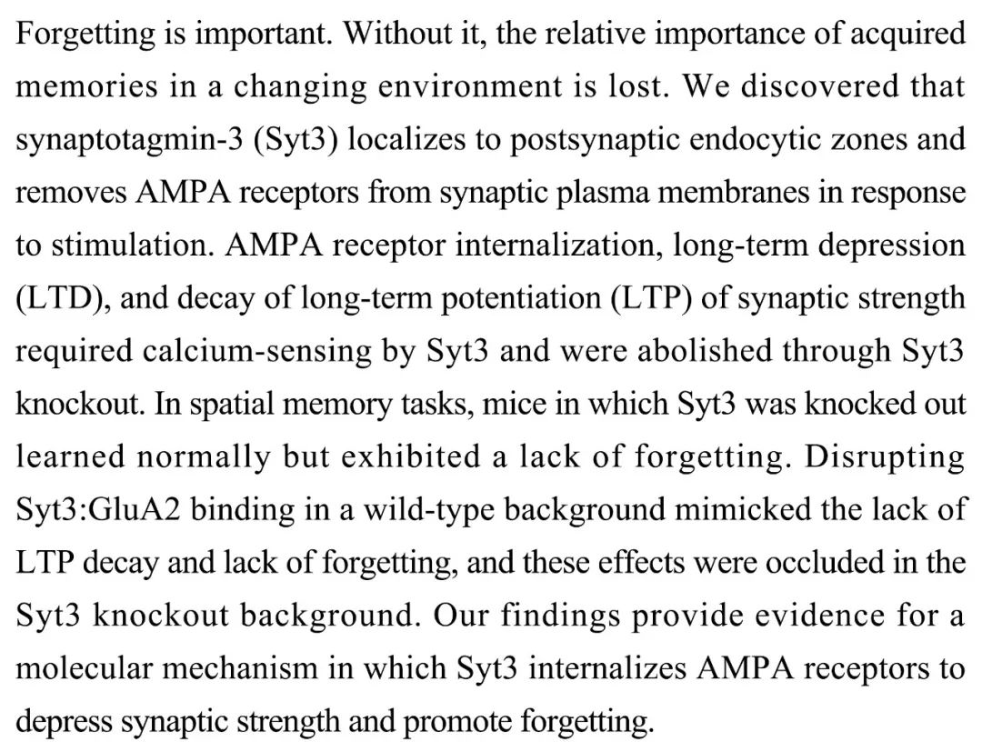 (导读 郭怿暄)遗忘是非常重要的。本研究发现突触结合蛋白-3(Syt3)位于突触后的内吞作用区域,并在刺激后从突触细胞膜上移除AMPA受体。而AMPA受体内化,突触强度出现长期抑制(LTD),长期增强作用(LTP)发生衰减都依赖钙敏Syt3。敲除Syt3导致小鼠可以正常学习,但不会遗忘。破坏Syt3:GluA2结合与缺乏LTP衰减和遗忘表型相似。该发现表明Syt3内化AMPA受体抑制突触强度,促进遗忘。