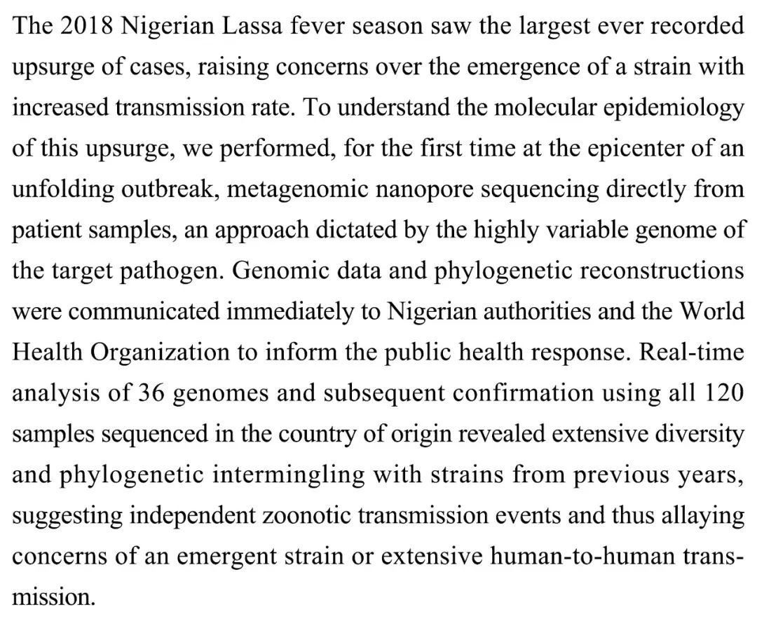 (导读 阿金)2018年尼日利亚拉沙热疫情爆发,出现有史以来最多病例激增。本研究为了解爆发背后的分子流行病学,在疾病爆发中心直接获得病人样本进行宏基因组纳米孔测序,并将获得信息及时与政府和WHO沟通指导公共卫生措施。对36个基因组进行实时分析并利用120例样品确认后,发现具有前几年病毒株的广泛多样性以及株间发生系统发生混合,表明并未出现全新病毒株或广泛人与人间传播。