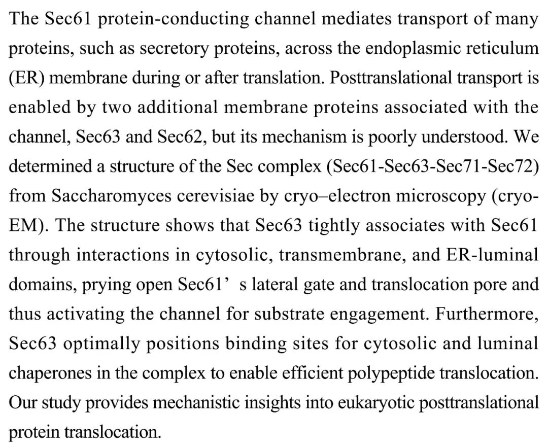 (导读 郭怿暄)Sec61蛋白传导通道介导许多蛋白质翻译中或翻译后的转运。翻译后转运还依赖Sec63和Sec62但机制未知。本研究解析了酵母Sec复合体(Sec61-Sec63-Sec71-Sec72)的冷冻电镜结构。发现Sec63通过胞质跨膜ER-腔结构域与Sec61紧密结合,使Sec61侧门打开,孔易位,激活通道促进底物结合。Sec63优化调控复合体与胞质和腔内分子伴侣的结合位点促进多肽高效易位。该发现揭示了真核细胞蛋白质翻译后易位的机制。
