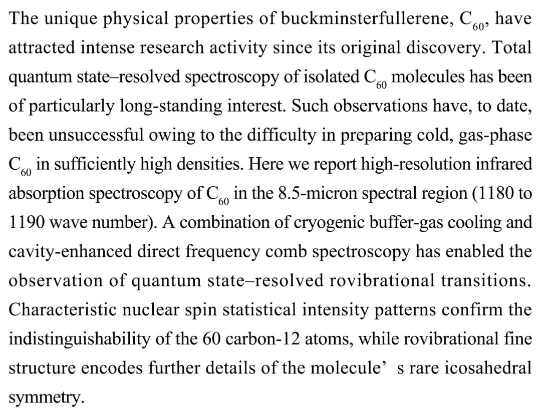 (导读 阿金)富勒烯C60分子的全量子态分辨光谱一直备受关注,但目前由于制备高密度冷气相C60的难度较高,尚无实验观测。本研究报道了在8.5微米光谱区域的C60高分辨率红外吸收光谱,观察到量子态可分辨的振转跃迁。其核自旋统计强度的特征模式确认60个碳12原子的不可分辨性。