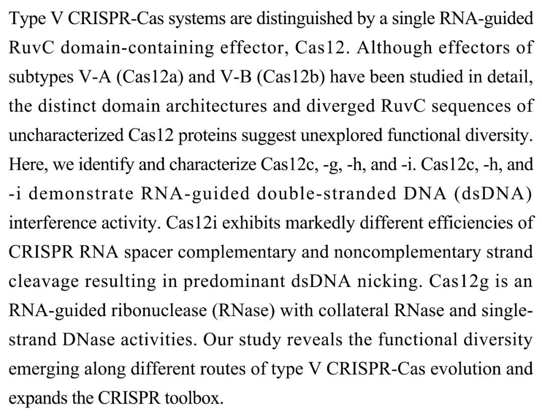 (导读 郭怿暄)V型CRISPR-Cas系统通过RNA引导且包含RuvC结构域的单个效应子Cas12加以区分。本研究鉴定出Cas12c,-g, -h和-i并进行表征:Cas12c, -h, 和-i具有RNA引导的双链DNA干扰活性。Cas12i在CRISPR RNA间隔序列的互补和非互补链上表现出差异巨大剪切效率。Cas12g是RNA引导的核糖核酸酶同时兼有单链DNase活性。该发现揭示了V型CRISPR-Cas的功能多样性,扩展了现有的CRISPR工具箱。