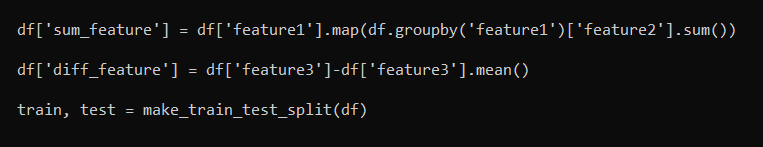 实际上,这两种特征(sum_feature 和 diff_feature)都不正确。它们正在泄漏信息,因为在拆分到训练集 / 测试集后,具有训练数据的部分将包含来自测试的一些信息。这将导致更高的验证分数,但当应用于实际的数据模型时,性能会更差。