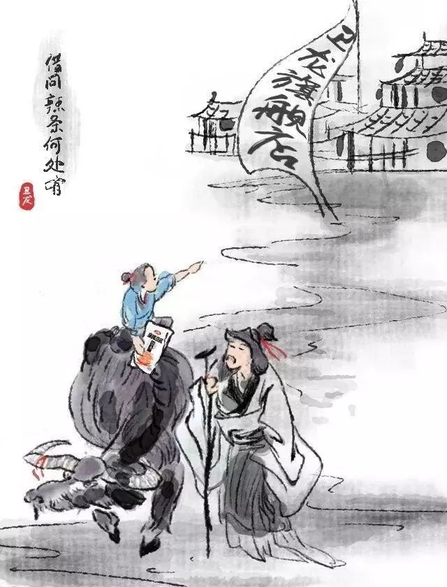 路上。行人:(欲断魂)借问酒家何处有?牧童:(遥指)杏花村。