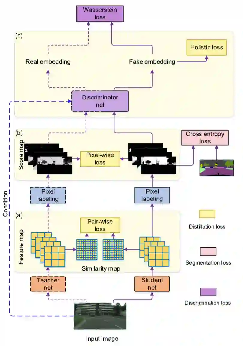 另一种更高层次的结构化信息是来自对图像整体结构相似性的度量,作者引入了对抗网络的思想,设计专门的网络分支分类Teacher网络和Student网络预测的结果,网络收敛的结果是该网络不能再区分Teacher网络和Student网络的输出。作者称这块损失函数为Holistic loss(整体损失)。