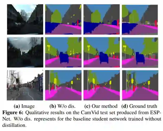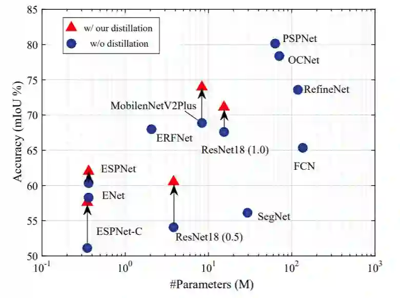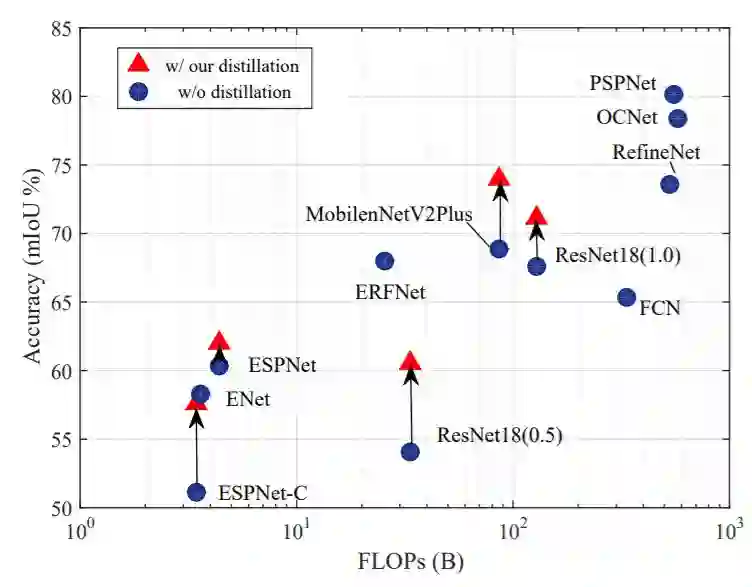 该文研究了在语义分割模型的知识蒸馏中引入结构化信息的损失函数,在不改变模型计算量的情况下,使用该方法在Cityscapes数据集上mIoU精度取得了最高达15.17%的提升。