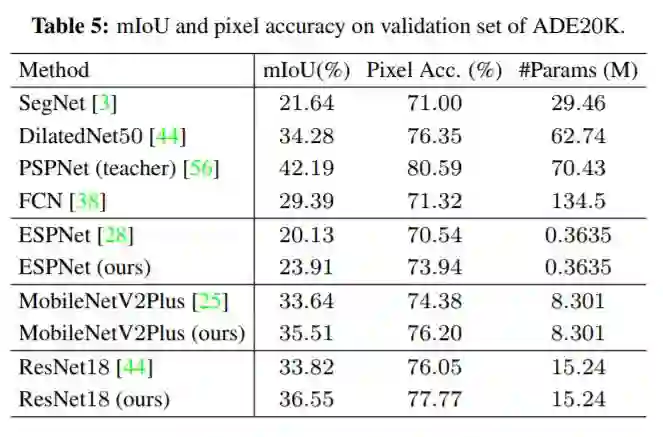 下图为在ADE20K数据集上的实验结果,同样所有网络模型的精度都获得了大幅提升!