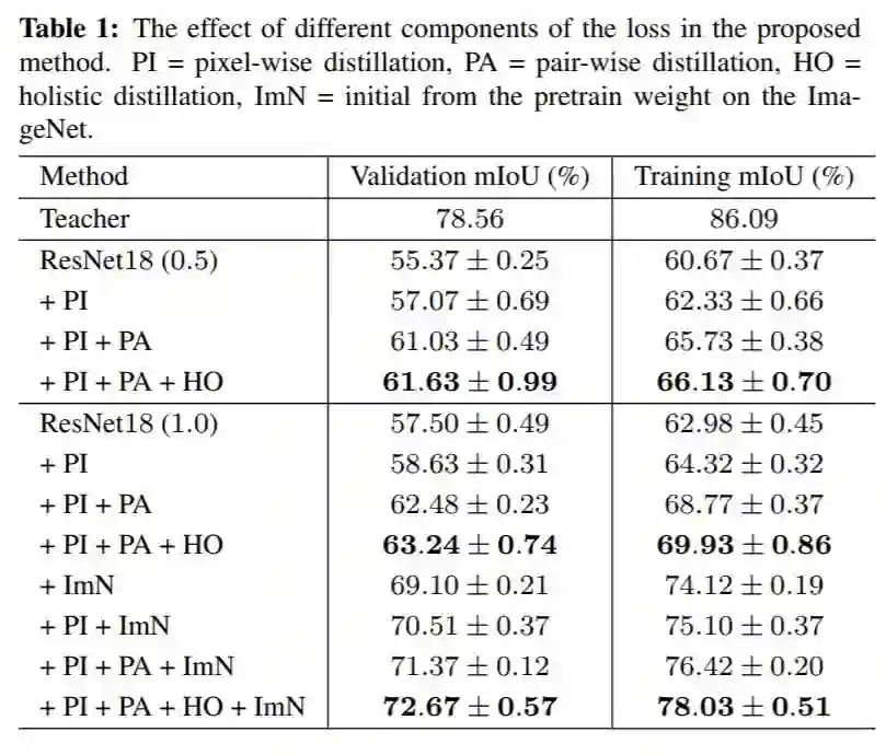 可知,作者提出的损失函数的各个部分都能使得Student网络获得精度增益,最高达15.17%!CV君发现逐像素对的损失(Pair-wise loss,PA)获得的增益最大。
