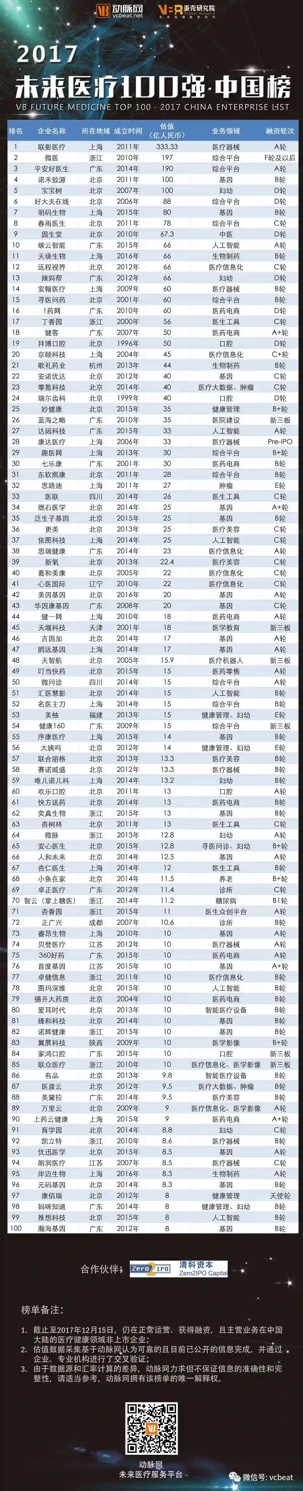 2017年,“未来医疗100强”榜单在吸收去年行业评选的基础上,引入公开评选、专家打分机制,挖掘医疗各细分领域最具代表性的潜力企业。为创新企业提供前行标杆、为投资机构作出指引,为受众提供价值。