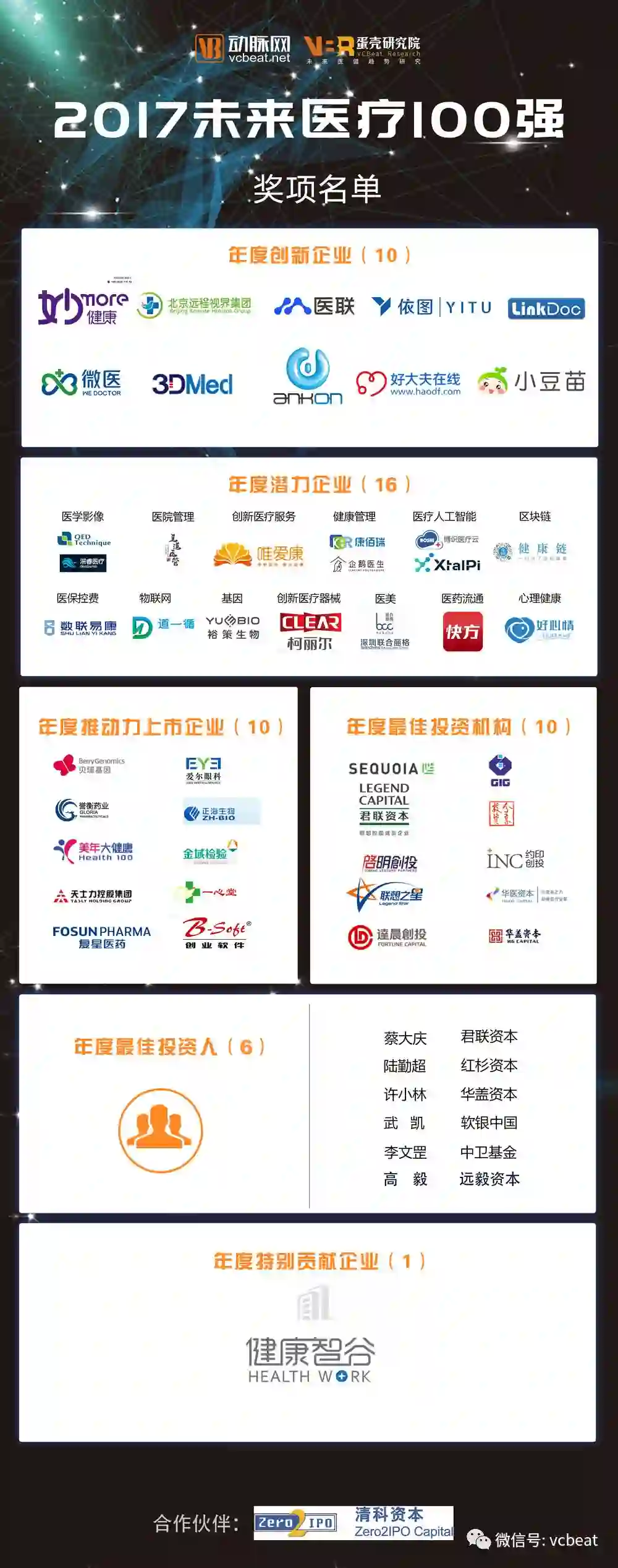 “未来医疗100强”2017年年度奖项,是从产业专家、投资人、创业实践者中公开甄选的评委进行投票,并由动脉网内容中心、蛋壳研究院及产业评委共同评选,最终呈现“创新企业”、“投资”、“产业链”3大类奖项,包括“年度推动力上市企业”、“年度创新企业”、“年度潜力企业”、“年度投资机构”、 “年度最佳投资人”等多项年度大奖。