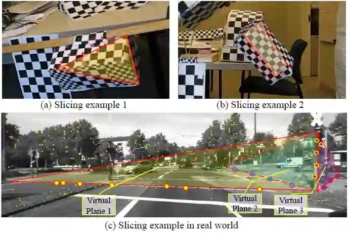 图 1:单应性变换的切片效果图。(a-b) 红色的点表示假设的内点。所有的点都分布在一个用黄色标示的虚拟平面上(立方体的一个切片)。(c) 虚拟的平面用三角形以及同色的内点标示。