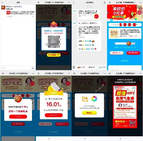 1. 裂变吸引:以便宜、利他和契合人群痛点的文案吸引用户点击,比如图中的文案“0元免费拿”、“大气物理学家”、“7节课”等都是为了引起好奇。