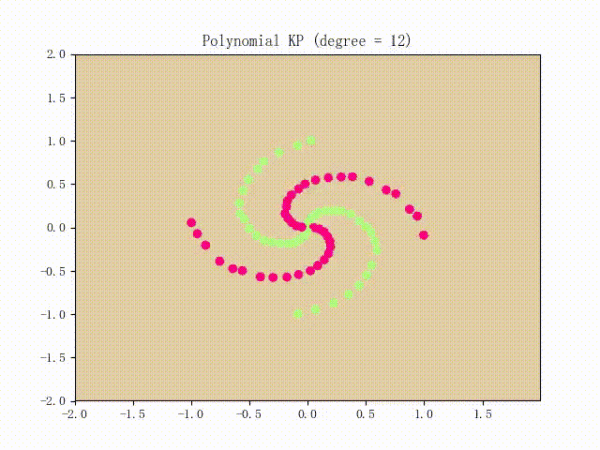 当我们对感知机应用核方法后,它就能对非线性数据集(比如螺旋线数据集)进行分类了,训练过程将如下: