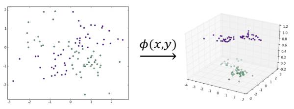 可以看到,虽然左图的数据集线性不可分、但显然右图的数据集是线性可分的,这就是核工作原理的一个不太严谨但仍然合理的解释