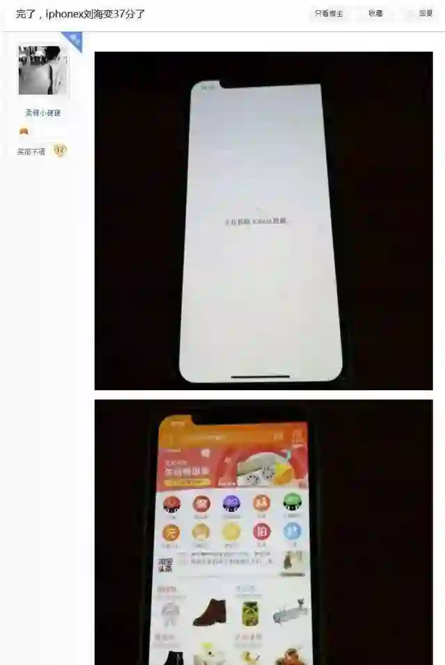除了 qdruid 的「斜刘海」iPhone X,也有其他用户在贴吧里发图,也是右边的「耳朵」不见了: