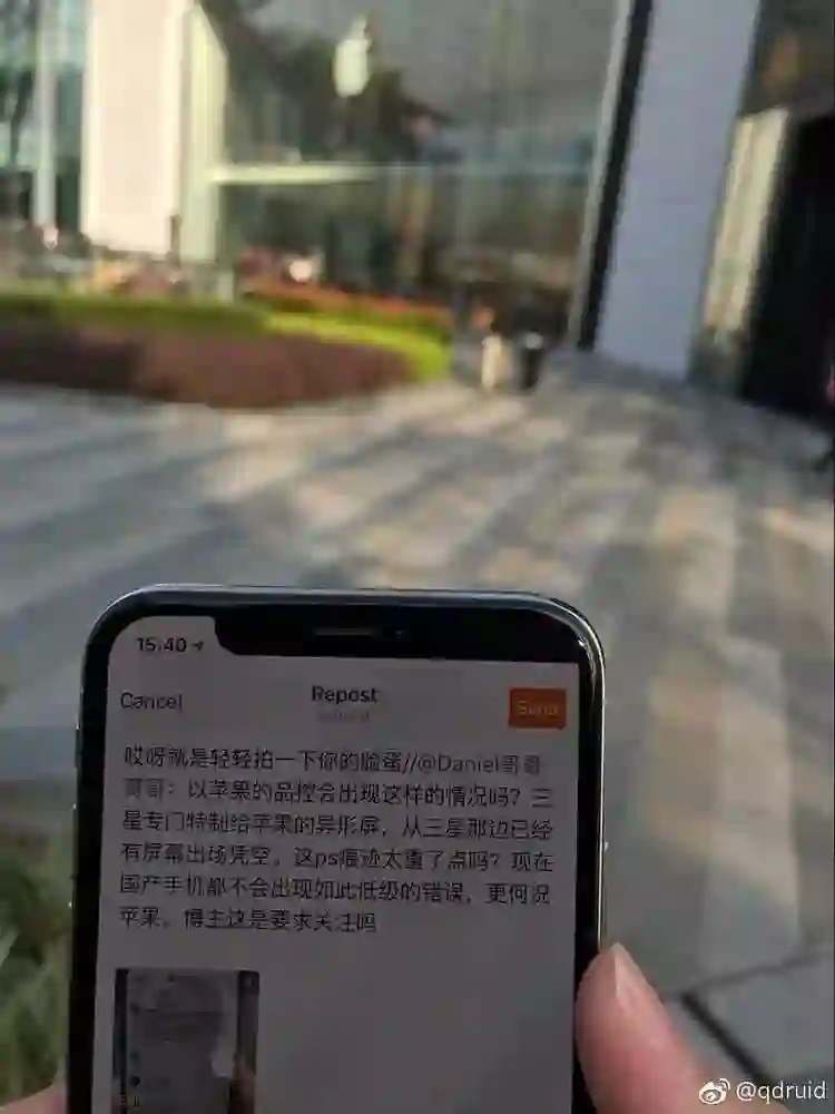 他把自己的「斜刘海」iPhone X 发到微博后,被人怀疑是为了求关注量而 PS 的。qdruid 截至目前的粉丝数是 102。