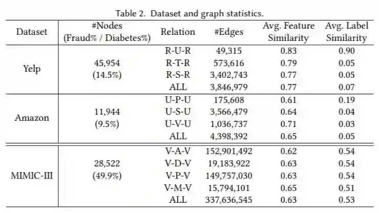 我们为两个任务场景和三个数据集的实验构建了不同的多关系图。表2列出了不同数据集节点和关系的各种统计信息。除了不同场景下的节点数和噪声节点的比例(Fraud%,Diabetes%),我们还给出了不同关系的边数。对于每个数据集中的每个关系,我们根据相邻节点的特征向量的欧氏距离(范围为0到1)计算相邻节点的特征相似度,并对平均特征相似度进行归一化。表2的最后一列显示了每个关系的平均标签相似度,它是根据两个连接的节点是否具有相同的标签来计算的。