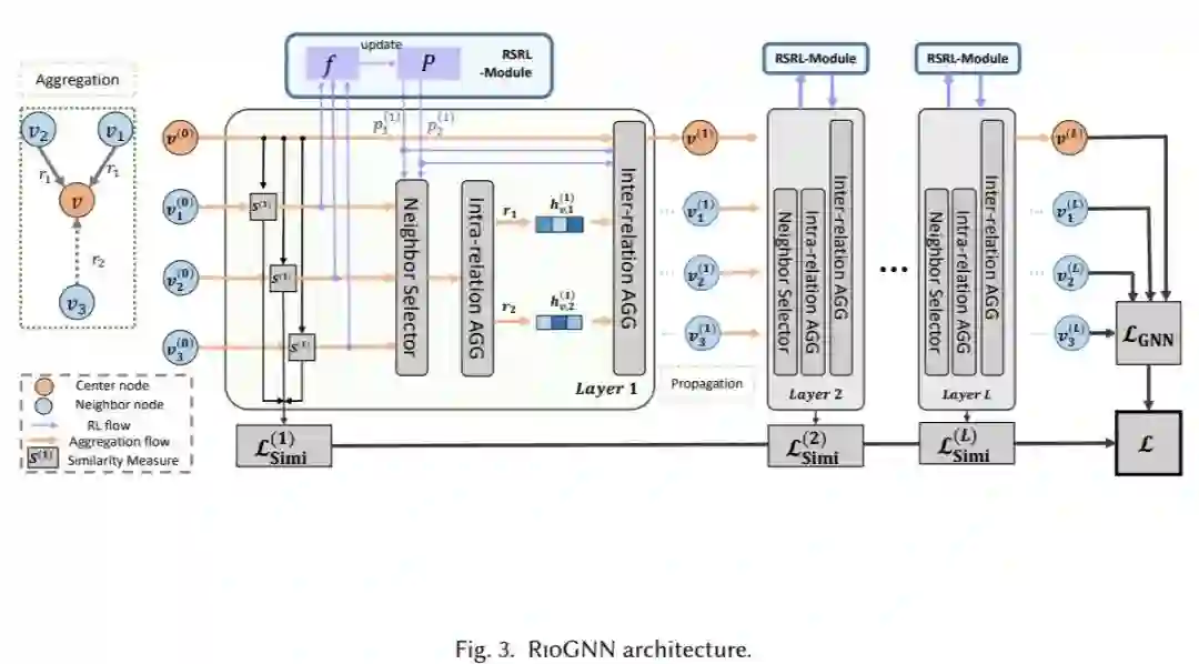 图 3 描绘了 RioGNN 的整体架构,由三个关键模块组成——标签感知相似性测量、相似性感知邻居选择器和关系感知邻居聚合器。此外,我们还描述了整体算法和优化。