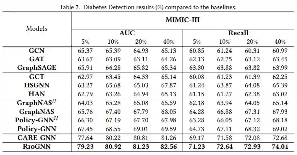 我们进行实验以评估 MIMIC-III 数据集上糖尿病诊断的准确性。 如表 7 所示,我们报告了 RioGNN 和各种基线和变体在 700 个 epoch 中的最佳测试结果。 从结果可以看出,在大多数训练比率和指标下,RioGNN 的表现优于其他基线和变体。