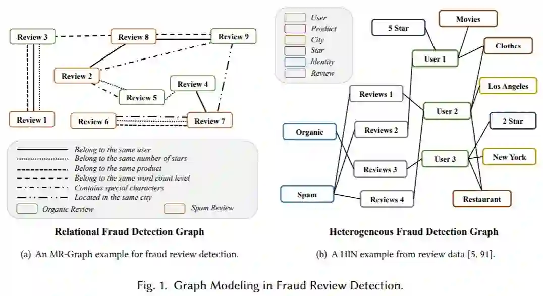 垃圾评论是指那些虚假的评论发布到产品或商家,目的是推广他们的目标。欺诈检测必须从自然的邮件中识别出垃圾邮件评论。由于垃圾评论添加了一些特殊字符或模拟良性的电子邮件行为(如一个用户发布垃圾邮件,同时保持一定频率的自然的评论),以避免被发现,这给区分垃圾评论带来了挑战。我们将具有不同标签的注释视为节点,将不同的代表性 交互视为不同类型的连接,从而构建多关系图,从而将此问题转化为双分类问题。