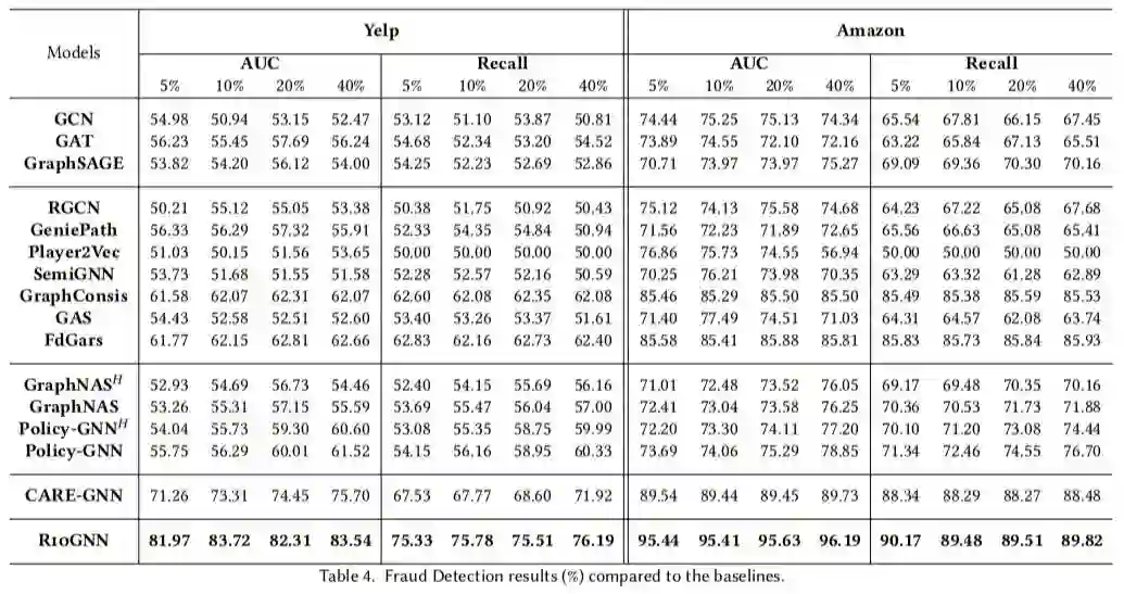 我们进行实验以评估 Yelp 和 Amazon 数据集上欺诈检测任务的准确性。 我们报告了 RioGNN、基线和变体在 500 个 epoch 中的最佳测试结果。 从结果可以看出,在大多数训练比率或指标下,RioGNN 的表现优于其他基线和变体。 这表明 RioGNN 在欺诈检测场景中的可行性。