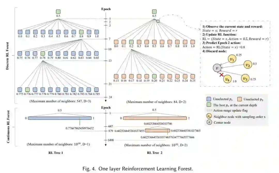 为了解决这些问题,我们在传统的基于强化学习的方法的基础上,提出了一种新颖的递归和可扩展强化学习框架 RSRL,不仅可以通过学习环境更新策略,而且可以使用递归结构快速、准确满足不同关系的精度要求。图 4描绘了基于森林的学习架构。 一棵树在每个epoch中的具体过程如右图所示,其中 和 分别代表上一个epoch之后的状态和奖励, (图中例子为0.5)代表当前epoch中预测的动作。 我们将 RSRL 制定为 L 层强化学习 (RL) 森林,并将第 层森林定义为: