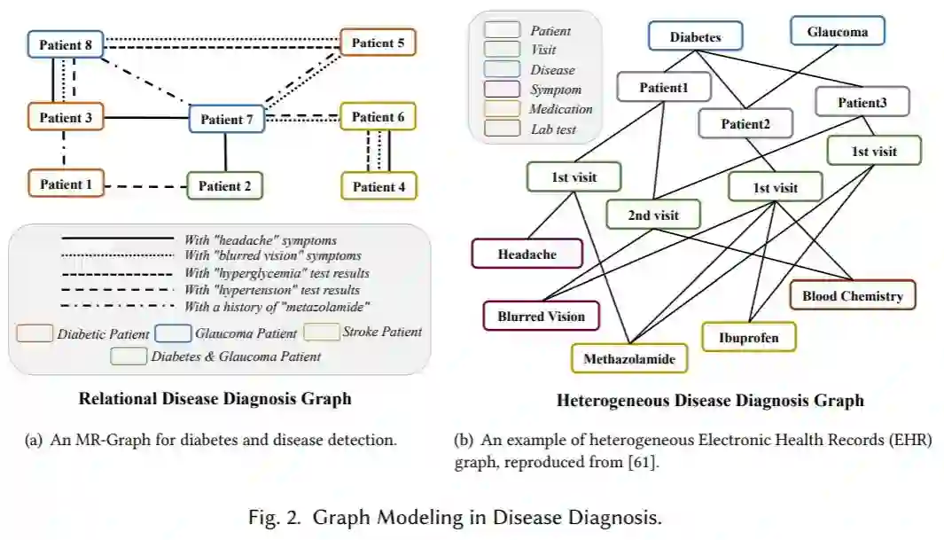 在疾病诊断任务中,糖尿病、脑卒中、青光眼是中老年人常见病,早期症状识别非常重要。 但由于这三种疾病的症状相似,临床上很难区分患者。例如,中风的症状包括视力丧失、突然虚弱和刺痛感,这与 II 型糖尿病患者的症状相似。此外,糖尿病的早期症状之一是由液体水平变化引起的视力模糊。因此,眼睛可能会改变形状,干扰眼睛的聚焦能力。虽然这种视力障碍可能表明患有糖尿病,但在青光眼患者中也是如此。在这里,将患者作为多关系图的节点,将具有不同相似症状的患者连接成不同类型的边,可以将任务转化为多分类任务。