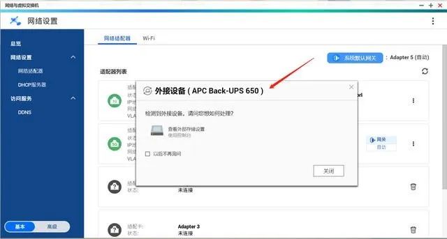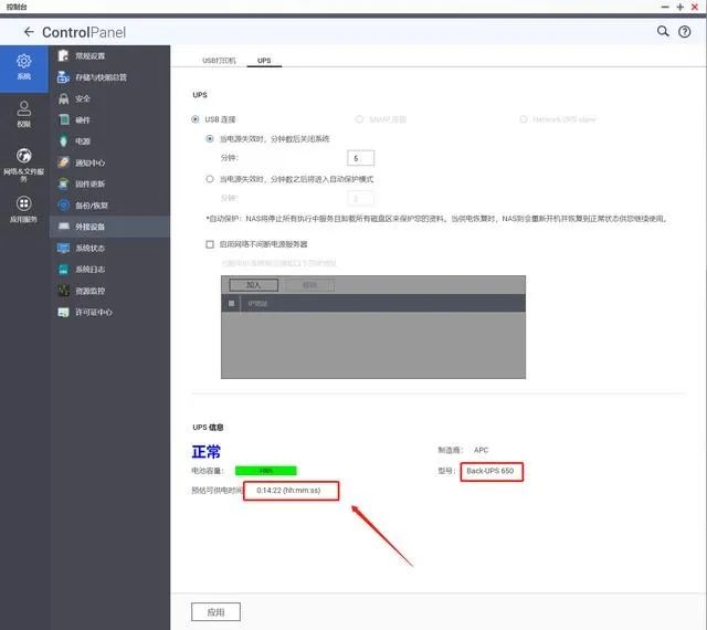 本身 NAS 产品数据安全还是最重要的,我选择的是搭配 APC 的 UPS650,接入 USB 设备之后在管理页面会弹出新的外置设备提示。前后 5 个 USB 接口,在扩展方面也更游刃有余。
