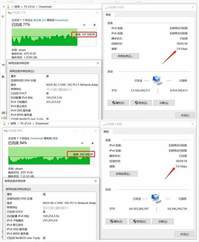 另外 QNAP 的 nas 在多网口模式下是支持虚拟交换机模式的,如果你没有万兆交换机,也可以选择虚拟交换机的方式之间通过 QNA-UC5G1T 的 5G 网卡直连 PC 的,可以看到 5G 的带宽已经被正常识别了。