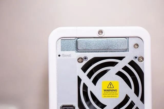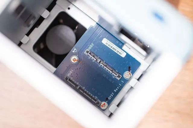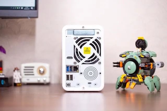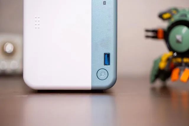 产品方面采用了白蓝色设计,作为主流的双盘位 NAS 来讲,这样的配色可能更适合融入家里的装修风格吧。相比传统的黑色设计的 NAS 来讲,这个外观可能会被更多新用户接受吧。
