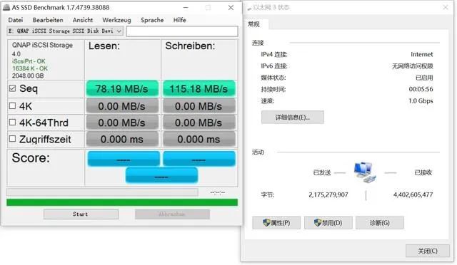 挂载好之后就可以用硬盘测速软件对于挂载的 iSCSI 硬盘进行测速,在千兆网络下读写速度和一般台式机 HDD 读写类似。