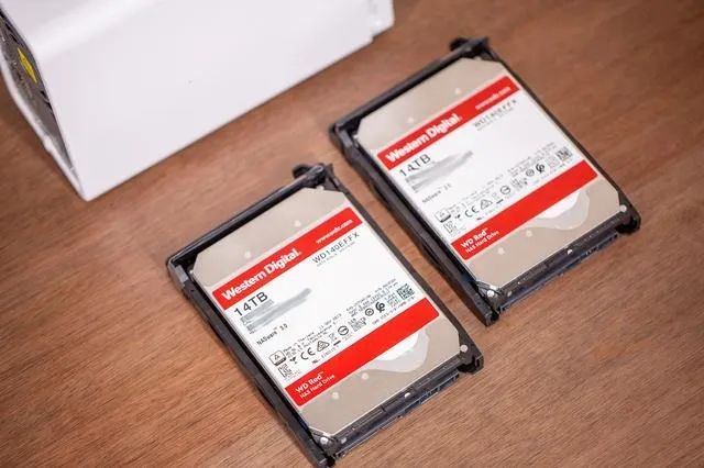 使用上,我拿了之前买的多的西数 14T 红盘一起测试,WD140EFFX 在多盘位 NAS 机箱中能保持可靠的性能。这样搭配双盘位的 NAS 可以更好的兼顾容量以及性能。