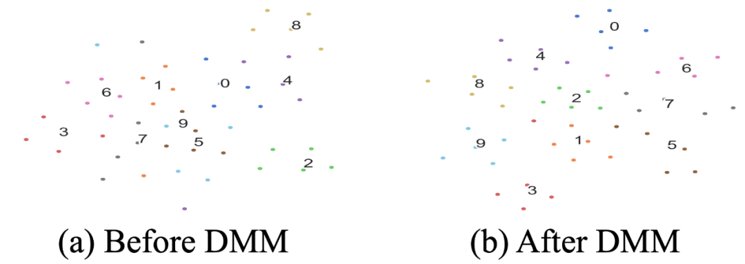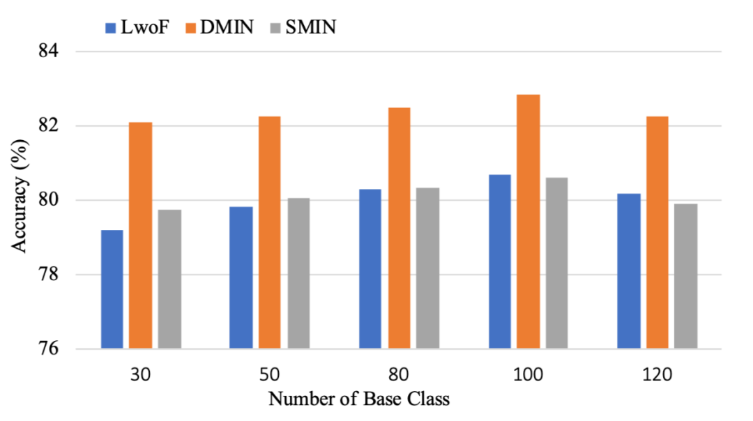 ▲ 图8 DMM模块分析 我们在 ODIC 数据集上变化监督学习阶段 base 类别的数量,然后观察其对小样本学习结果的影响,图 9 可以发现当 base 类别从 30 增长到 100 的时候,由于在监督学习阶段学到了更强的文本 embedding 特征,最终结果是随着 base 类的数量而提升的。但是在 base 类为 120 的时候出现下降,这是由于 unseen 类别的占比太低的时候,模型整体对 unseen 类别的识别能力也会受到影响。