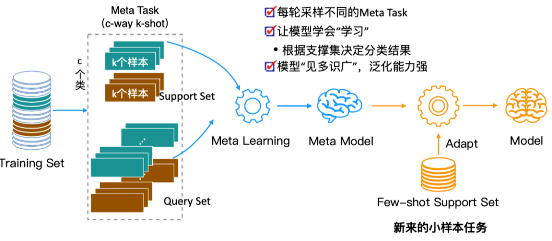 人类非常擅长通过极少量的样本识别一个新物体,比如小孩子只需要书中的一些图片就可以认识什么是“斑马”,什么是“犀牛”。在人类的快速学习能力的启发下,研究人员希望机器学习模型也具备这种能力,对于新的类别,只需要少量的样本就能快速学习,这就是 Few-shot learning 要解决的问题。 小样本学习的的目标是模型在大量类别中学会通过少量数据正确地分类后,对于新的类别,只需要少量的样本就能快速学习。如图 2 所示,形式化来说,few-shot learning 的训练集中包含了大量的类别,每个类别中有少量样本。 在训练阶段,会在训练集中随机抽取 C 个类别,每个类别 K 个样本(总共个 CxK数据)构建一个 meta-task,作为模型的支撑集(Support set)输入;再从这 C 个类中抽取一批样本作为模型的询问集(Query set)。即要求模型从CxK 个数据中学会如何区分这 C 个类别,这样的任务被称为 C-way K-shot 问题。 模型训练的过程中在每次迭代时把支撑集送入模型,并优化模型在询问集上产生的损失函数,这种训练方式一般称为 Episode-based meta-training。值得注意的是这种训练机制使得模型很难过拟合,假设我们训练集中包含 159 个类,可以产生 个不同的 5-way 任务。