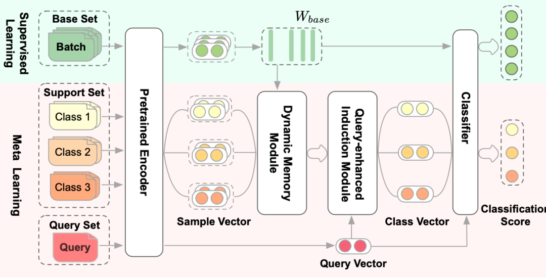 通过这种方式训练的 base 分类器,属于同一个类的特征向量必然会和对应的分类参数特别接近,所以最后的分类参数 W 就可以做为 base 类的类别特征,进而做为 meta learning 的记忆模块。 在 meta learning 阶段,我们将类别向量和 query 向量一起输入该分类器,得到新类别的分类打分: