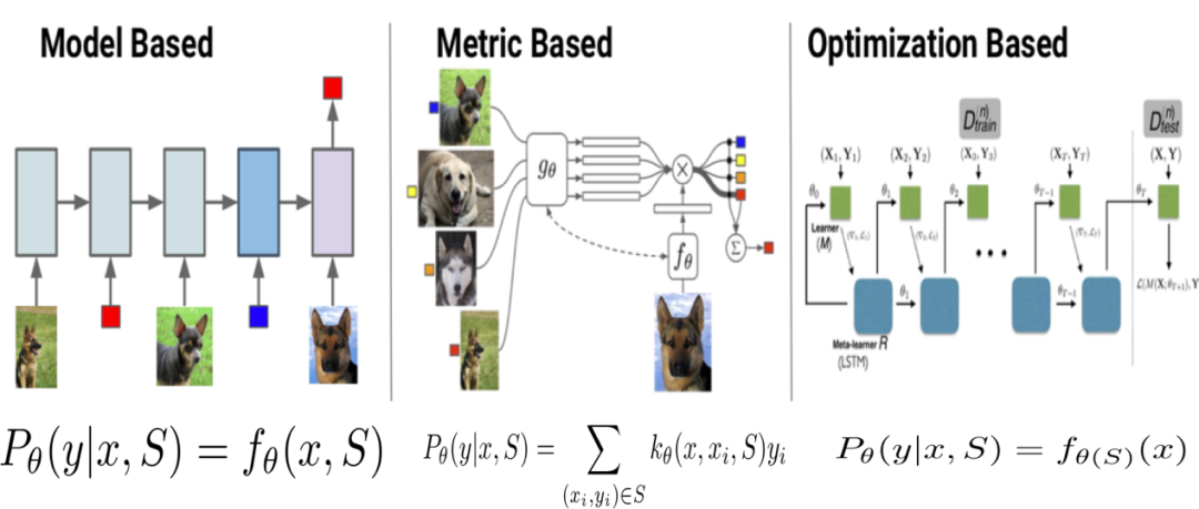 现有的 few-shot learning 模型大致可分为三类,如图 3 所示: Mode Based,Metric Based 和 Optimization Based。其中 Model Based 旨在通过模型结构的设计快速在少量样本上更新参数,直接建立输入 x 和预测值 P 的应设函数;Metric Based 方法通过度量 batch 集中的样本和 support 集中样本的距离,借助最近邻的思想完成分类;Optimization Based 方法认为普通的梯度下降方法难以在 few-shot 场景下拟合,因此通过调整优化方法来完成小样本分类的任务。具体内容可以参考我们之前的小样本学习综述。